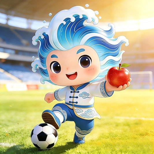 可爱的吉祥物“烟小浪”来啦!这小家伙,一头蓝白相间的浪花发型,手里拿着红苹果(是不是想咬一口),脚下还踩着足球,简直是萌态可掬,让人爱不释手!“烟小浪”不仅代表了烟台的海浪文化,还寓意着足球赛事的欢乐与激情。有了它,烟台足球的赛场,必将更加热闹非凡。